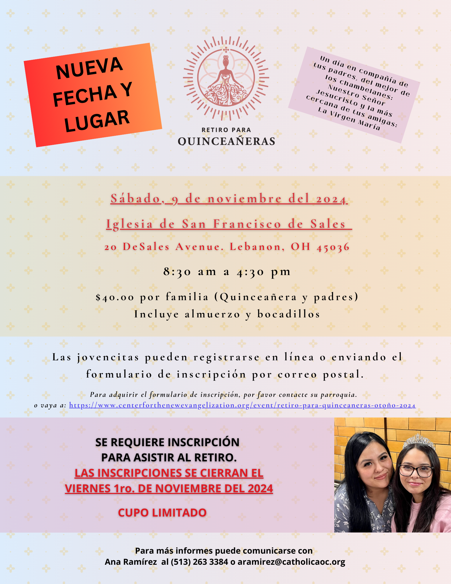 La celebración de los 15 Años es una Acción de Gracias dadas a Dios, Dador de la Vida. El Ministerio Hispano extiende una invitación muy calurosa a las chicas que festejan sus 15 años para que participen en el Retiro de Quinceañeras otoño 2024. La asistencia de sus padres es requerida y con ellas agradecen a Dios por la vida de su hija. Será un momento de reflexión espiritual sobre lo que significa convertirse mujer ante los ojos de Dios.
