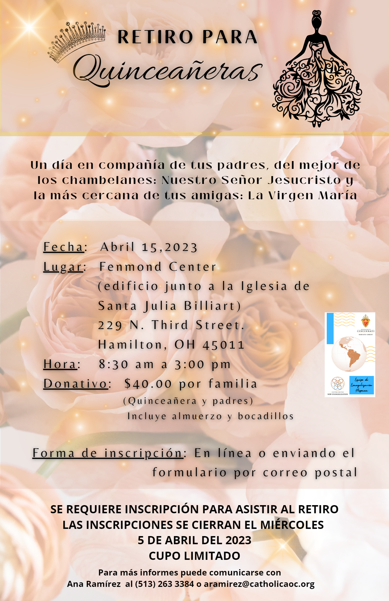 La celebración de los 15 Años es una Acción de Gracias dadas a Dios, Dador de la Vida. El Ministerio Hispano extiende una invitación muy calurosa a las chicas que festejan sus 15 años para que participen en el Retiro de Quinceañeras otoño 2022. La asistencia de sus padres es requerida y con ellas agradecen a Dios por la vida de su hija. Será un momento de reflexión espiritual sobre lo que significa convertirse mujer ante los ojos de Dios. Les aseguramos que será un día lleno de buenos momentos que quedarán grabados en su memoria.