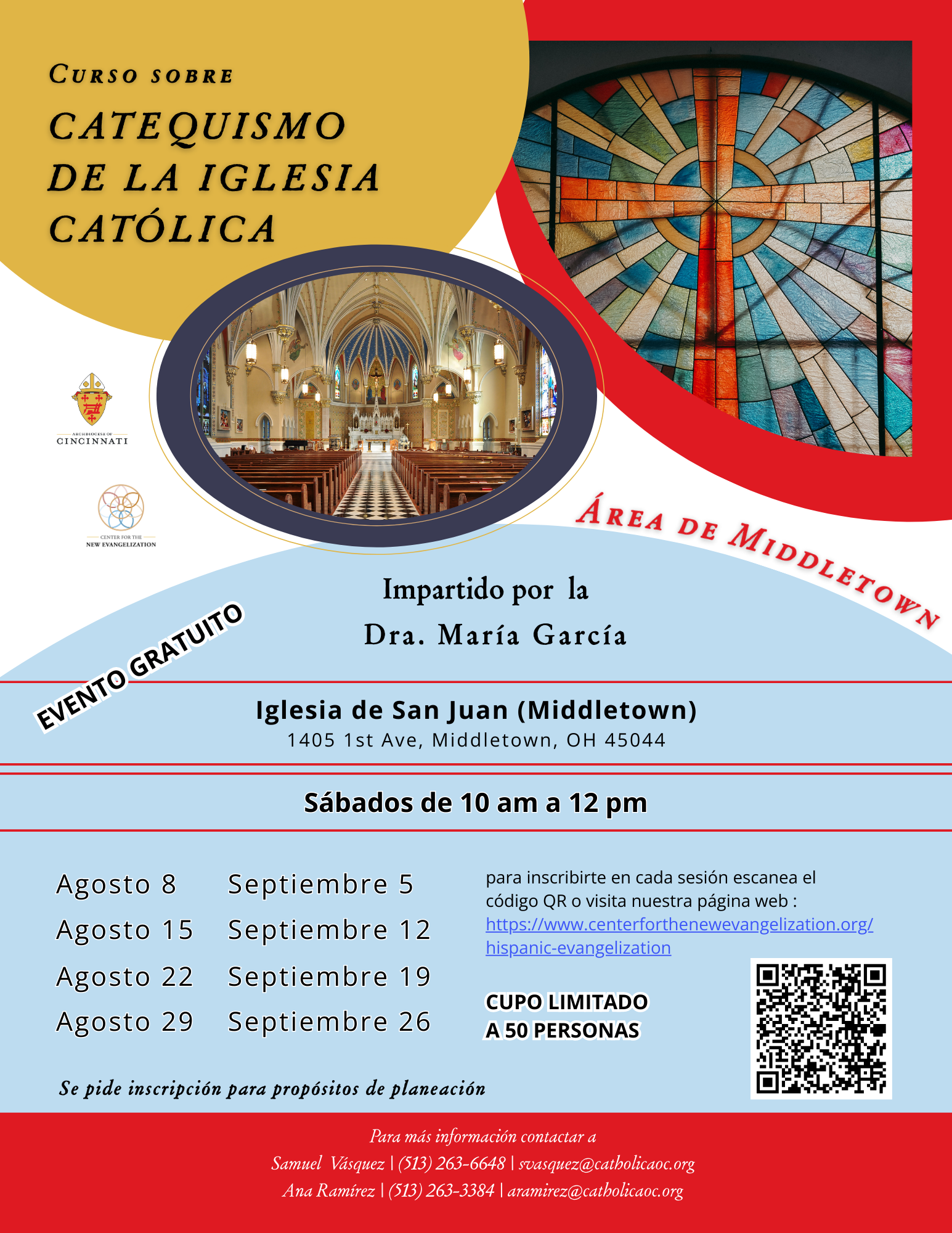 Profundiza en las riquezas de la fe católica con nuestro curso de catecismo, impartido por la Dra. María García en la Iglesia de San John en Middletown, Ohio. A través de sesiones claras y participativas, podrás conocer mejor el Catecismo de la Iglesia Católica y fortalecer tu vida de oración, tu comprensión de los sacramentos y tu relación con Cristo. La participación es completamente gratuita; solo necesitas el deseo de aprender y dejarte acompañar por la Iglesia en este camino de fe.